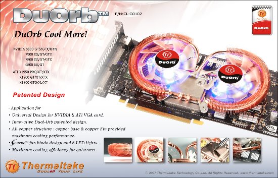 為此曜越科技經過長時間的籌劃、設計以及研發階段,於07年6月台北Computex展特別為您推出新一代顯示卡散熱器 – DuOrb VGA Cooler。